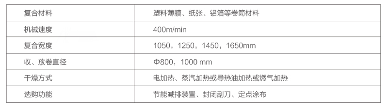 收放卷:獨立塔式雙工位收放料架,無軸氣頂裝置,換卷自動裁切,放卷EPC裝置。 涂膠:直接凹版式涂布,氣動刮刀。 烘箱:三段頂開式高效恒溫干燥箱,整個烘箱采用負壓.............